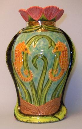 The Seahorse Vase is painted in shades of green, pink and orange.