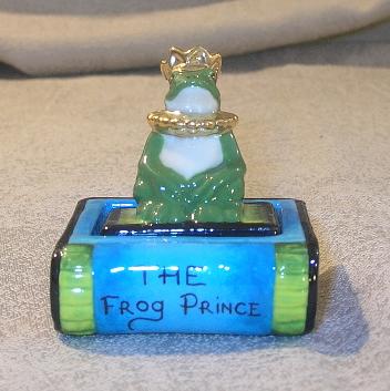 The frog prince is wearing a 24 carat fired gold crown and collar. He sits upon a book that tells his magical story. The